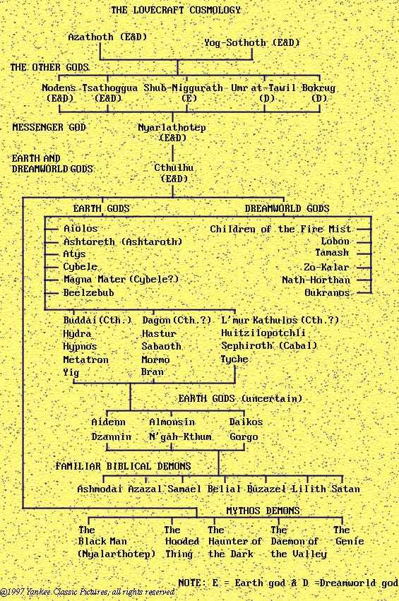 Tal como Lovecraft concibió las deidades o fuerzas de sus Mitos, estaban, inicialmente, los Dioses Arquetípicos, ninguno de los cuales, salvo Nodens, Señor del Gran Abismo, es designado con su nombre; estos Dioses Arquetípicos - eran deidades benévolas, representaban las fuerzas del bien y vivían en o cerca de Betelgueuse, en la constelación de Orión, decidiéndose muy raramente a intervenir en la incesante lucha entre los poderes del mal y las razas de la Tierra. Estos poderes del mal eran conocidos como los Primigenios o Primordiales, aunque esta última denominación es aplicada en la ficción, especialmente a la manifestación de uno de los Primordiales en la Tierra. A diferencia de los Arquetípicos, los Primordiales son citados por sus nombres y hacen espantosas apariciones en algunos de los cuentos. Por encima de ellos está el dios ciego e idiota Azathoth, «ciego amorfo de la más baja confusión que blasfema y burbujea en el centro de toda Infinitud, Yog-Sothoth, el «Todo-en-lo uno y Uno-en-el-todo», comparte el dominio de Azathoth y no está sujeto a las leyes del tiempo y el espacio. Nyarlathotep, que es probablemente el mensajero de los Primordiales, el Gran Cthulhu, que mora en R'lyeh, la ciudad que se oculta en las profundidades del mar; Hastur el Innombrable, semihermano de Cthulhu, que ocupa el aire y los espacios interestelares, y Shub-Niggurath, el cabrón negro de los bosques con sus mil jóvenes», completan la lista de los Primordiales, tal como fue concebida originalmente. Los paralelos en la ficción macabra son evidentes, ya que Nyarlathotep corresponde al elemento terreno, Cthulhu al elemento acuático, Hastur al aéreo, y Shub-Niggurath es la concepción lovecraftiana del dios de la fertilidad.